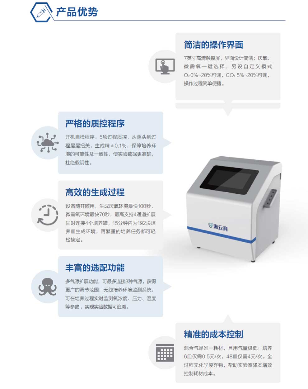7英寸高清触摸屏,界面设计简洁;厌氧、微需氧―键选择,另设自定义模式O:0%~20%可调,CO:5%~20%可调,操作过程简单便捷。 精准的成本控制